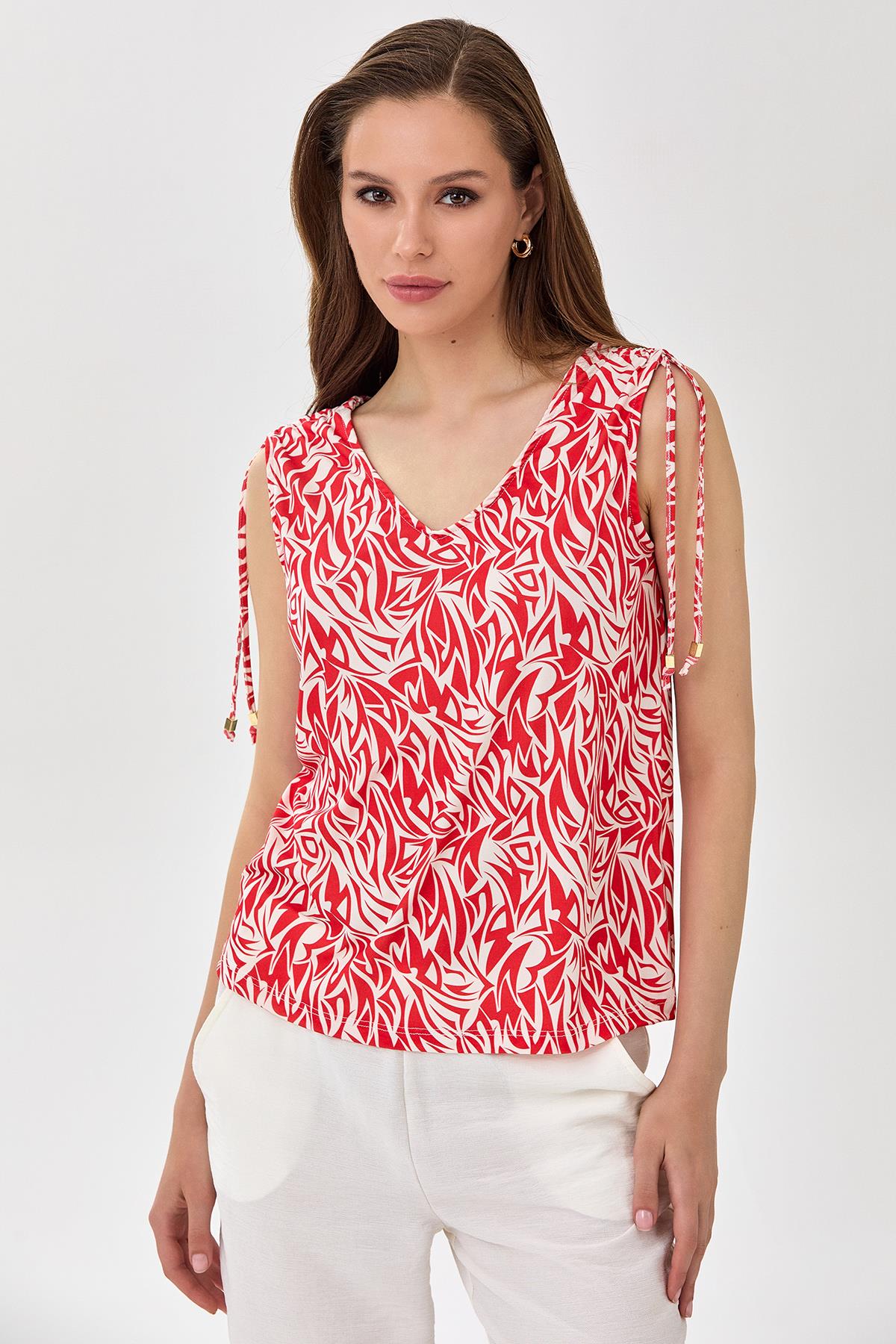 Omuzları Büzgülü Bağcıklı Kolsuz Bluz 025-1016