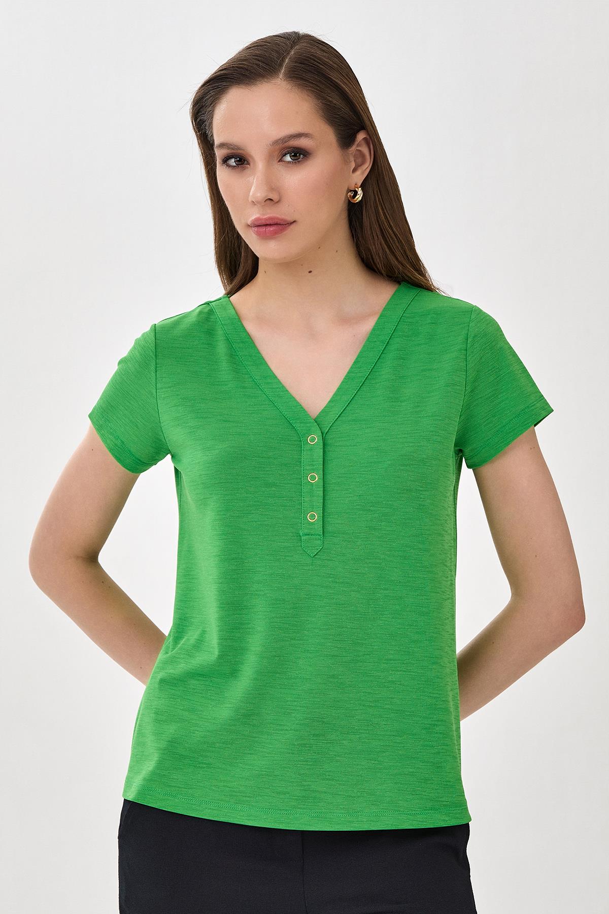 V Yaka Önü Çıtçıtlı Kısa Kol Bluz 025-1047